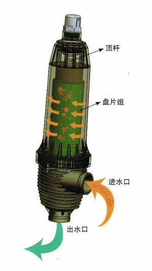 来水从侧部的进水口沿切线进入过滤单元,腔内来水压力驱动外壳上部的隔膜装置,并带动顶杆下压盘片组,盘片组被压紧形成致密过滤芯,水中杂志被滤芯拦截后,出水经由滤芯中心部位的鸭嘴阀至下部的出水口。